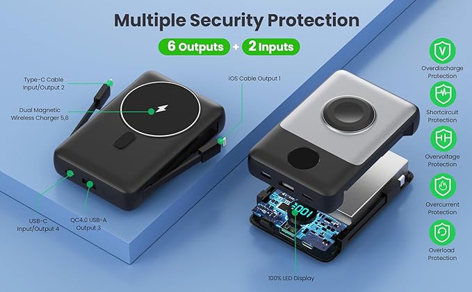 - 【6 Device Charging, 6 Outputs & 2 Inputs】6-in-1 versatile portable charger features double-side magnetic wireless charging capability (7.5W for iPhone/Airpods and 3W for Apple Watch) , built-in 2 cables (18W iOS + 25W Type C), 2 USB ports (25W USB-C + 18W USB-A), total 6 outputs fast charging for 6 devices simultaneously, owning this powerful, quick-charging solution keeps all your devices powered up efficiently and conveniently. (USB-C port and Type-C cable support input/output)