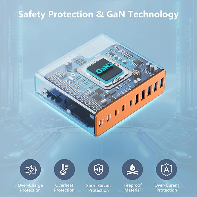 - Multiport USB-C & A Charging Station: Boasting to charge up to 10 devices at once, this versatile charging block features 5 USB-C ports and 5 USB-A ports. The dedicated USB-C port powers newer electronics like laptops, while the legacy USB-A ports support older devices. Unlike most chargers with false advertising and outputs that slow down when multiple ports are used.