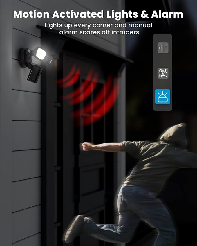 - ใ๐๐จ๐ญ๐ข๐จ๐ง ๐๐๐ญ๐๐๐ญ๐ข๐จ๐ง & ๐๐ง๐ฌ๐ญ๐๐ง๐ญ ๐๐ฅ๐๐ซ๐ญ๐ฌใEquipped with a 150ยฐ PIR motion sensor, this flood light camera activates ultra-bright 2,600-lumen floodlights and sends instant alerts to your smartphone when movement is detected. Customize detection areas, adjust sensitivity levels (1-10), and set the duration of floodlight cam activation to suit your specific needs for optimal security coverage.