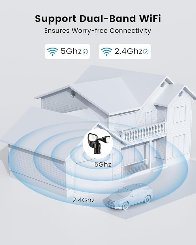 - ใ๐๐๐ ๐๐ข๐ ๐ก-๐๐๐ฌ๐จ๐ฅ๐ฎ๐ญ๐ข๐จ๐ง & ๐๐ฎ๐๐ฅ-๐๐๐ง๐ ๐๐ข-๐ ๐ขใExperience crystal-clear surveillance with our 5MP floodlight camera, capturing more detail up to 49 feet (15M) in darkness thanks to advanced IR lights. This outdoor security camera supports dual-band Wi-Fi (2.4GHz and 5GHz), ensuring stable, fast, and reliable connectivity for seamless monitoring.
