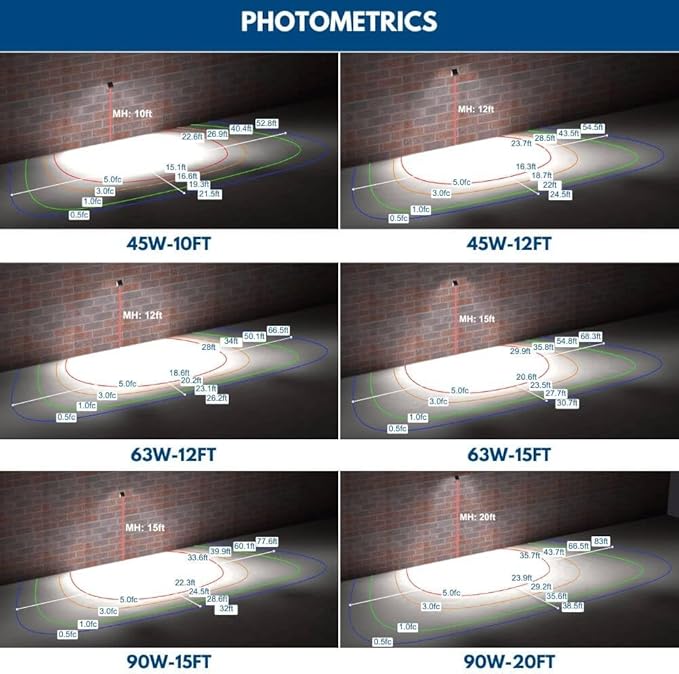 - Flexible Lighting Choices - The Konlite KWPD LED wall pack offers 90W (11,7700LM - 13,950LM), 63W (10,200LM - 10,400LM), and 45W (6,450LM - 6,600LM) options, along with 3 color temperatures (3000K, 4000K, 5000K) for tailored illumination, ensuring optimal visibility for indoor and outdoor spaces. The dimensions of the light are 14.33"W x 7"D x 9.26"H.