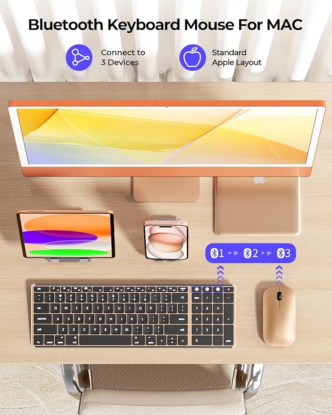 - Perfect for Apple Users: The Bluetooth keyboard and mouse is designed for Mac users with a standard apple layout. With advanced BT1/BT2/BT3 modes, this combo allows you to easily type across three devices, perfect for your Mac, MacBook Pro/Air, iPad