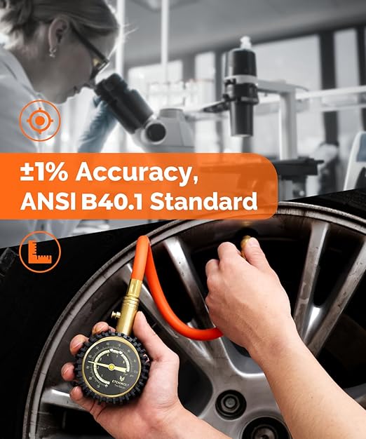 - FLEXIBILITY AND CONVENIENCE: The tire pressure gauge for cars with hose features a 360-degree swivel chuck, allowing easy valve access from any angle, ensuring precise readings and effortless use, even in confined spaces