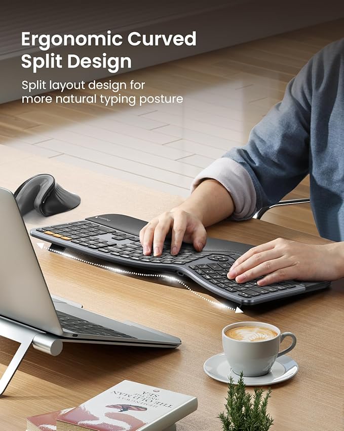 - USB-C Fast Charging: The ergo keyboard is equipped with a large 2000mAh rechargeable battery, offering extended working hours—especially with the backlight turned off. Focus on your tasks without worrying about frequent charging