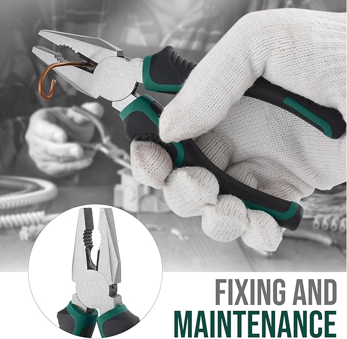 - Wiring and Cutting: Full-size combination pliers with integrated mini cutters; ideal for gripping, twisting, and cutting; snip wires, tighten nuts and bolts, pull nails