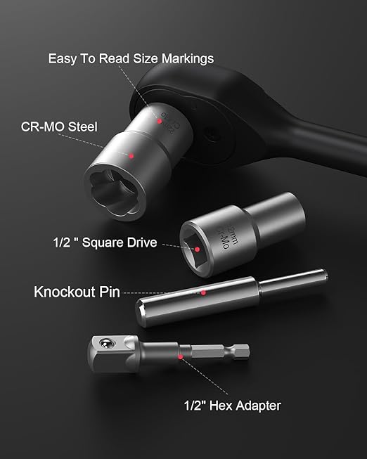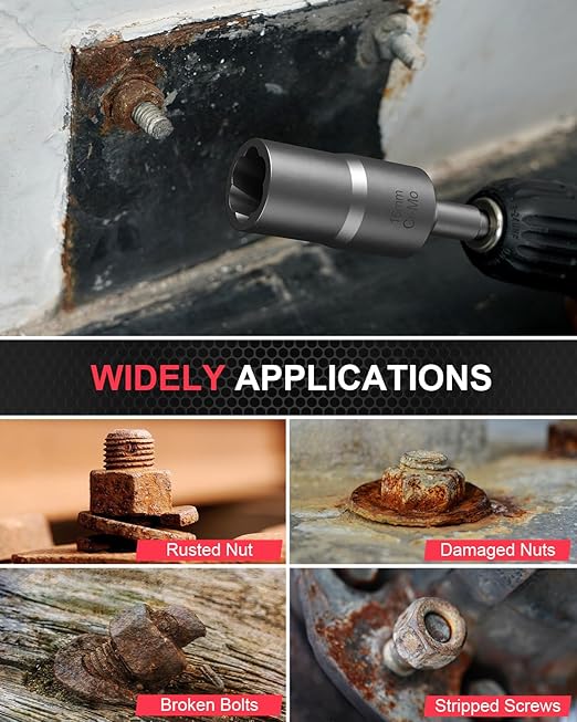 - 【Easy to Use and Compatible】Compatible with 1/2" square drivers, drills, and ratchets, this stripped bolt extractor set is simple to use. Attach the socket, turn, and remove with ease. The included knockout pin helps clear stuck nuts, ensuring quick and efficient repairs