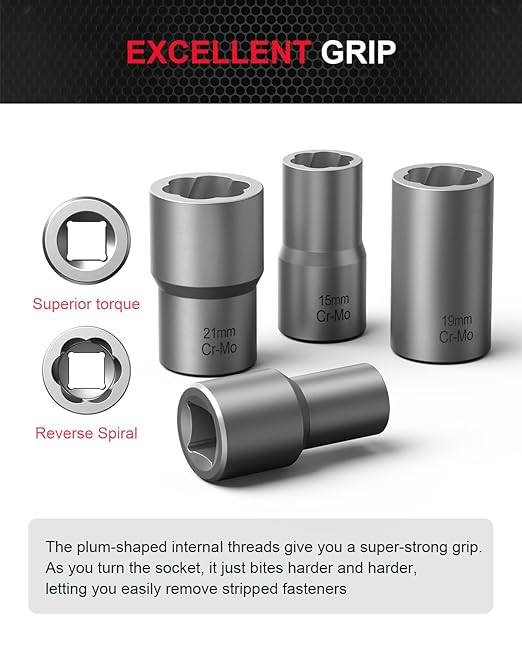 - 【Perfect Design】The 2.6-inch deep well design allows easy access to bolts and nuts in tight or recessed areas. Perfect for removing spark plugs and other hard-to-reach fasteners, this feature compensates for the limitations of shorter extractor sockets. Reverse spiral threads provide a tight grip on damaged fasteners, provide reliable torque, ensuring easy removal