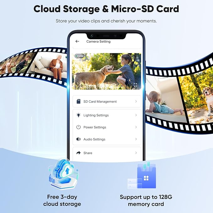 - Free 3 Days of Cloud, SD Card Storage: The solar battery powered camera supports cloud storage and SD card storage. Cloud storage has 3 days of free cloud storage, so your surveillance videos can be easily saved and viewed at any time. The SD card (not included) supports up to 128GB. The SD card allows data to be saved locally, which can effectively prevent data loss caused by network interruption or service failure, and protect privacy and security.
