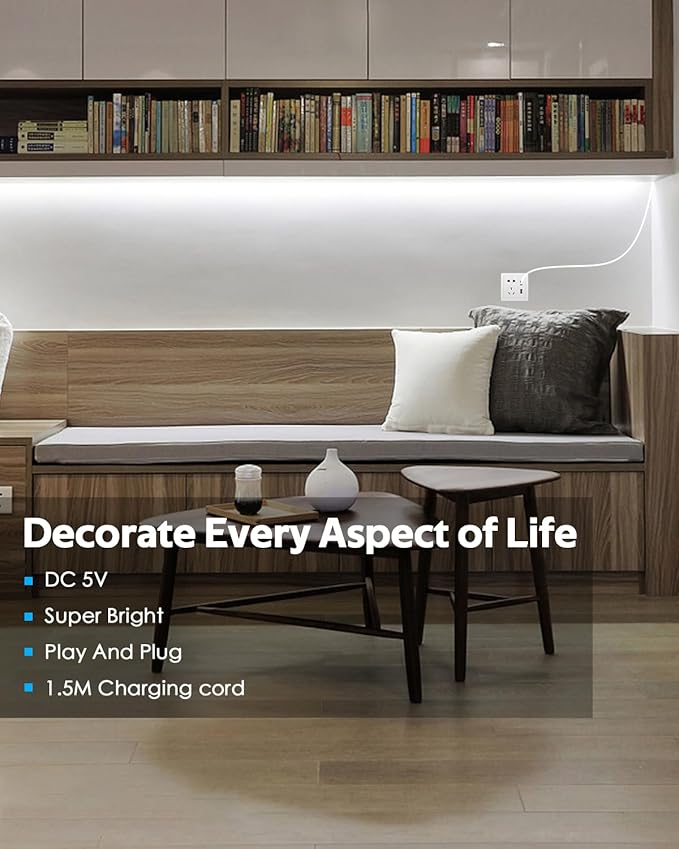 - 【Super Bright COB Strip Light】 Output voltage: DC 5V, high density 320pcs LED/M, CRI>85. 5V cold white LED strip light is made of super dense bead arrangement, so the cob strip light emits light more evenly and brightly, no black spots, more friendly to our eyes. Low heat generation, safe and touchable, perfect for indoor holiday decoration.