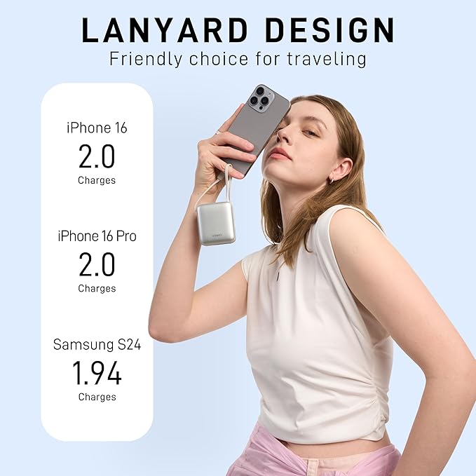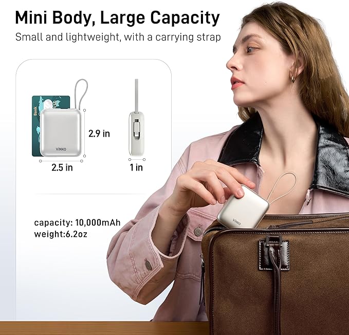 - COMPACT&PORTABLE: This portable charger for iphone measures just 2.9 x 2.5 inches (credit-card size), offering a more compact overall footprint at only 176g. Its thoughtfully thicker build (1 inch) delivers greater capacity and rugged durability, while enhancing grip comfort. With a built-in cable and sleek design, this travel essentials battery pack slips effortlessly into any pocket,Perfect for daily commutes, travel, or outdoor adventures,quickly powers up your phone.