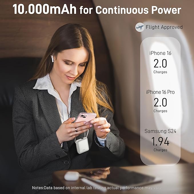 - LARGE CAPACITY: Boasting a robust 10,000mAh portable charger with usb c, this travel charger for multiple devices ensures you never run out of juice when you need it most. It provides multiple charges on a single full charge, capable of recharging an iPhone 12/13/14/15/16 Pro up to two times and an iPhone 12/13/14/15/16 Pro Max approximately 1.5 times. Say goodbye to power anxiety during trips or long days out—this power bank for backpack keeps your devices running when you need them most.