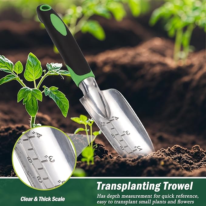 - 【Garden Tool Set】: The garden tool set includes 4 pieces useful hand tools: trowel, Transplant Trowel, hand rake,Gloves. This gardening tool set are Crafted from heavy-duty aluminum which are strong and durable, with high hardness and no need to worry about rusting and breaking.