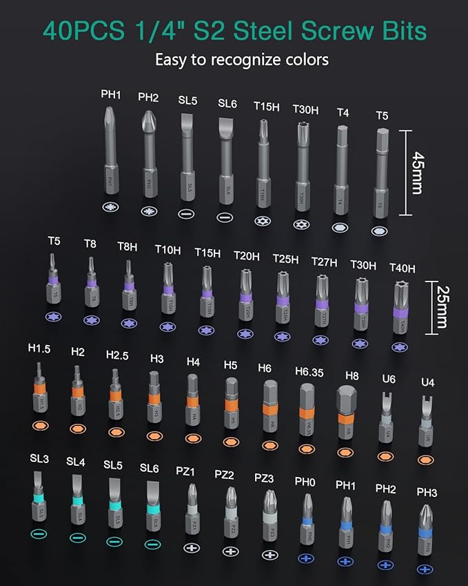 - Sturdy Material & Strong Magnetic: The handle is made of super-hard aluminum alloy, comes with 40 S2 alloy steel bits that resist wear and oxidation for long-lasting use. Contains a built-in magnetizer inside the storage box to prevent loss and easily enhance magnetism.