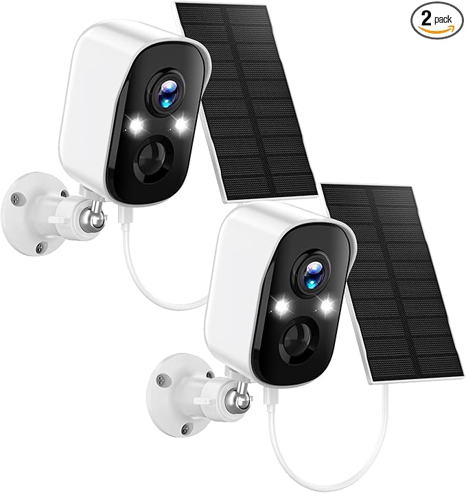 Solar Security Cameras Wireless Outdoor,2K Solar Camera Wireless for Home, 2.4GHz WiFi,Color Night Vision,Two-Way Talk,IP66 Waterproof,Two Spotlights,Cloud/SD(2 Packs,White)