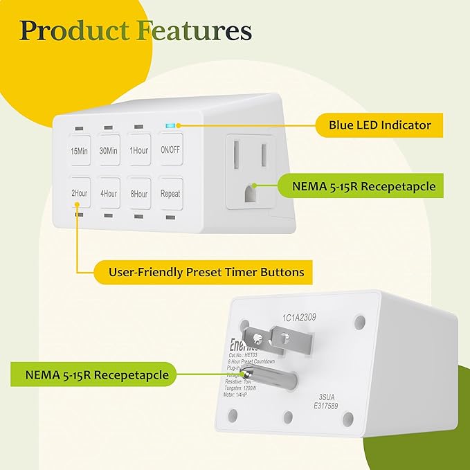 - TG 8-button preset timer switch with LED indicators. 6 timer options (15, 30 min, and 1, 2, 4, and 8 hours) with “Repeat” and “ON/OFF” buttons