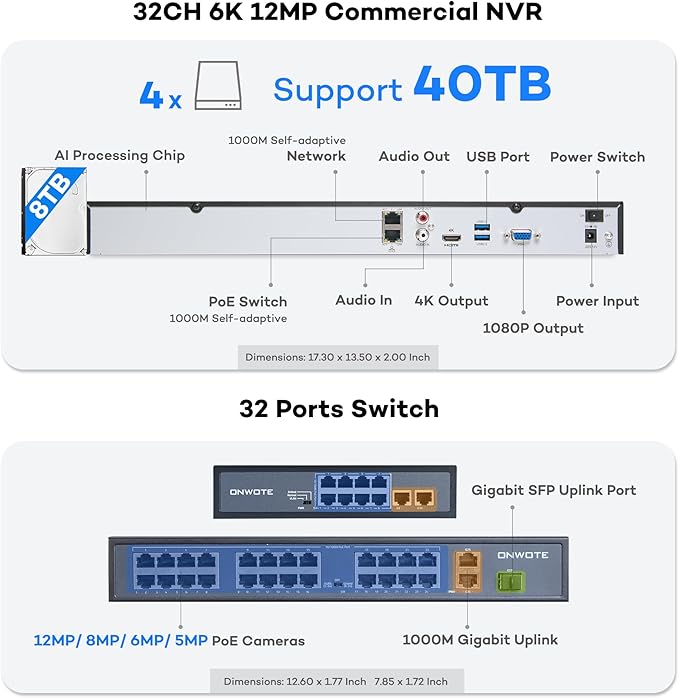 - 32CH 6K 12MP NVR-- Supports up to 32 cameras with resolutions up to 12MP, offering flexibility and scalability for your security needs. Additional add-on options available from ONWOTE.