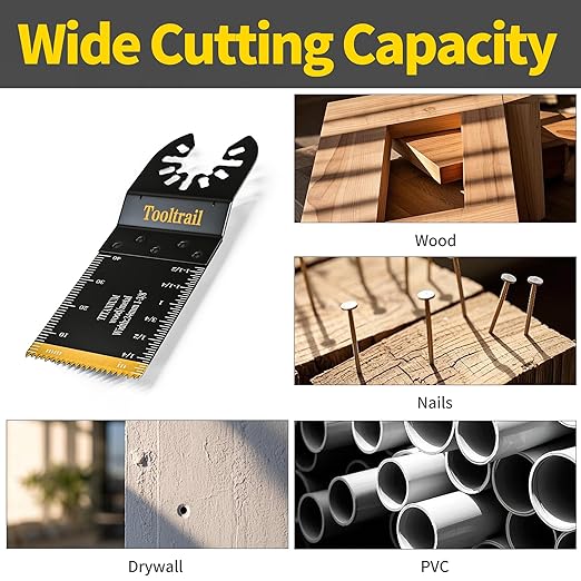 - Titanium Carbide Coating:The oscillating tool blades are made of high-quality high carbon steel and titanium plated Bi-Matel, (50% harder), optimized for cutting metal, wood, aluminum, PVC, drywall, door frames, and flooring. Heat-treated to resist warping, chipping, and overheating during heavy-duty tasks