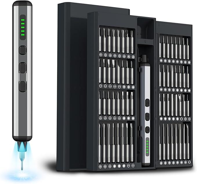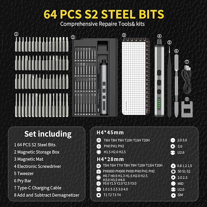 - 【What's in the Box】: 1x Mini Electric Screwdirver,64x Precision Magnetic Bits(see the picture for all bits),1x Magnetic Storage Case,1x Pry Bar,1x Tweezer,1x Magnetizer,1x Magnetic Mat,1x USB Type-C Charging Cable,1x User Manual