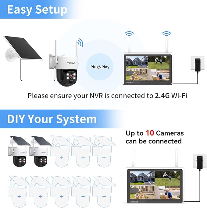 - 10CH NVR System – This all-in-one wireless solar security camera system features a 10-inch IPS HD display (non-touch) . Built-in 500G hard drive supports local storage with zero recurring fees or hidden subscriptions. Extend coverage by adding 6 VORGUT full-color night-vision cameras wirelessly