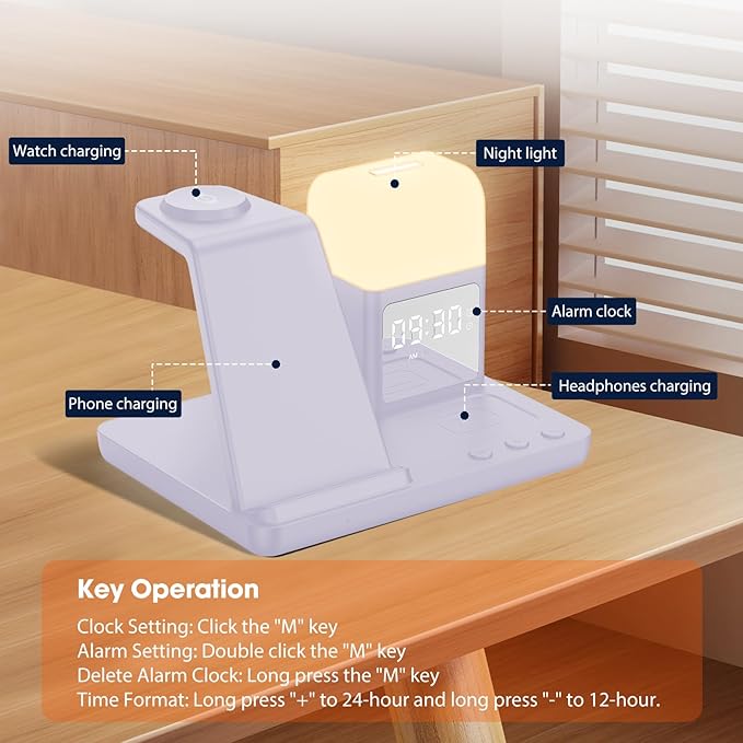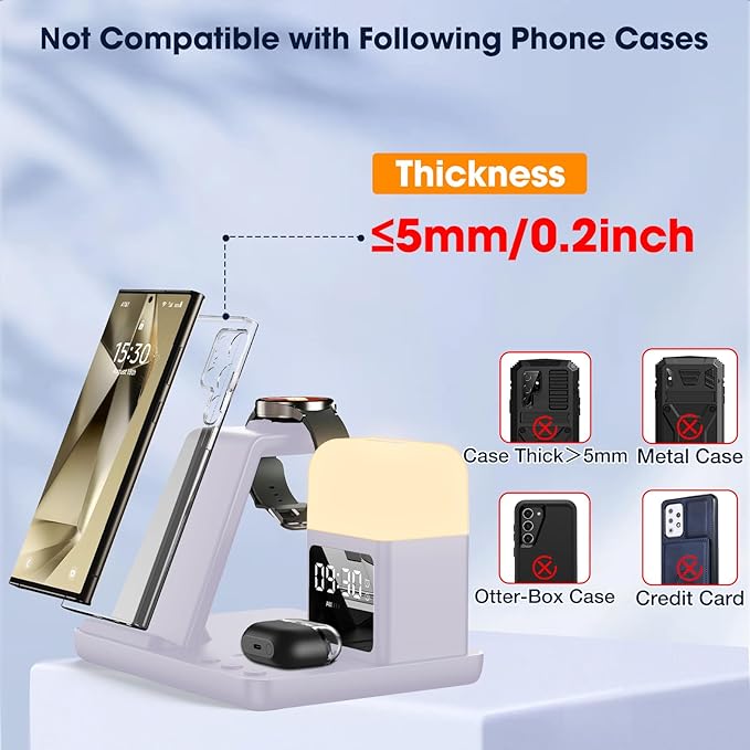 - Perfect Choice for Samsung Users: Hicevaiy 6 in 1 wireless charger station is specifically designed for Samsung devices. It charges your phone, watch(ONLY compatible with Samsung Watch listed), and earbuds at once, reducing cable and keeping your desk tidy. Perfect for the office, bedside table, or living room, it easily meets the charging needs of multiple devices. It's also a handy nightlight, clock, and alarm clock