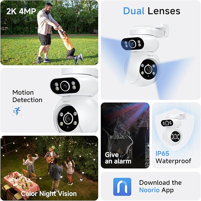 - 1 Device = 2 Cameras, 2K Ultra HD Resolution & Color Night Vision - Noorio outside cameras capture stunning 4MP 2K resolution with dual-lens precision, crystal-clear during the day, and illuminated by 4 infrared + 4 white LEDs for up to 65ft of full-color night vision. Whether monitoring your driveway, backyard, or porch, the Noorio outdoor security camera delivers sharp details even in low light, ensuring 24/7 vigilance without color distortion