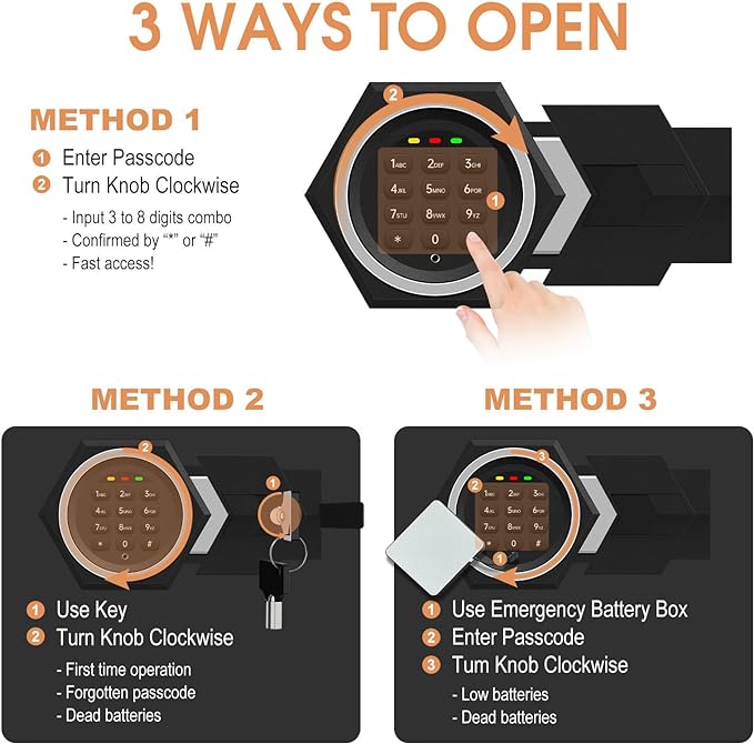 - 【DIGITAL SAFE WITH COMBINATION LOCK】: Our personal safe has 2 unlocking methods: Designed with 3-8 digit PIN numbers and spare keys, you can set a 3-8 digit password for your home security safe. Advanced digital keypad with programmable code, backup key system, and heavy-duty locking bolts for maximum protection