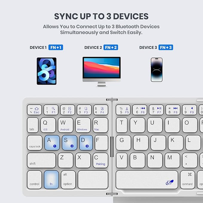 - 【Compatible & Stable】Universal compatibility with iOS, Android and Windows means this portable keyboard works seamlessly with all your must-have devices. Three Bluetooth channels allow you to connect and instantly switch between up to 3 devices at the tap of a hotkey. effective connection distance of 33 feet, providing ultra-stable, ultra-low latency wireless connectivity. Your bluetooth keyboard will automatically remember and reconnect to the last devices used when powered on, simplifying your workflow across systems and screens (NOTE: The touchpad does NOT work with system below iOS 13 )
