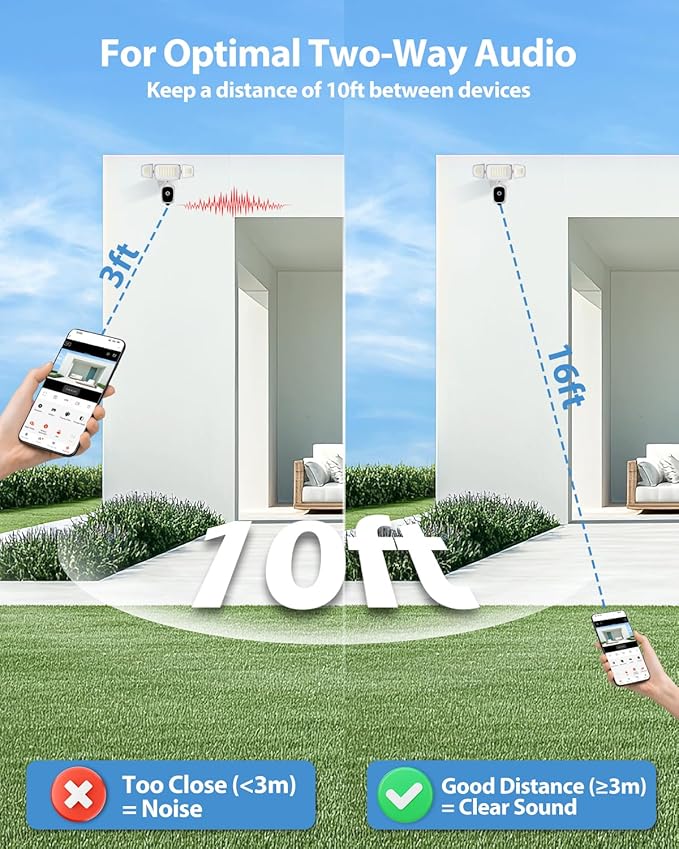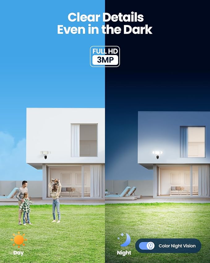 - 2K QHD & Enhanced Color Night Vision: Our floodlight camera outdoor captures vibrant, detailed footage 24/7. With superior 2K resolution and advanced low-light technology, enjoy crisp surveillance day or night—far clearer than standard flood light cameras