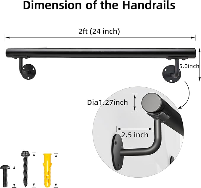 - 【Quality Black Pipe Handrail】: These black stair rails, crafted from high grade steel pipe with 1.5mm wall thickness and support with solid sturdy brackets, 2ft length is great to install on stairway, upgrade the safety of your families: the pregnant, children, elderly and disabled that who needs the helper.