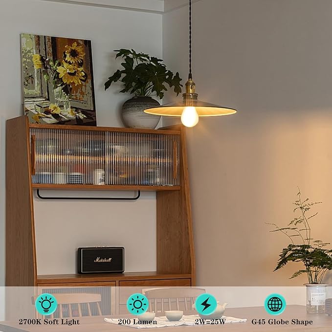 - Energy-Saving:Energy-efficient G45 edison LED bulbs that shine bright while saving power. At just 2W, each bulb equals 8 incandescent bulbs yet lasts 25,000 hours - that's 20+ years of use! Enjoy 85% energy savings, lower bills, and fewer replacements. Perfect for chandeliers, vanity mirrors and home decor.
