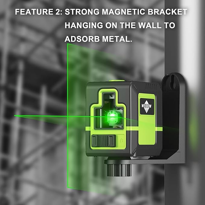 - This laser level is equipped with a 1200mAh lithium battery, a L-shaped magnetic mounting bracket, and a 1-meter tripod. These auxiliary accessories make the usage process convenient and simple. There is no need to worry about the battery's endurance, as it can remain powered on continuously for 10 hours.