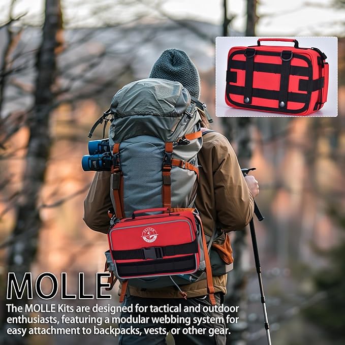 - MOLLE - COMPATIBLE DESIGN - In critical situations, every second counts. The MOLLE - equipped first - aid kit ensures rapid deployment. Allowing you to attach it to your backpack, vests or tactical belts. Once attached via the MOLLE system, the first aid kit stays firmly in place. Keep your emergency supplies within easy reach, wherever your adventures take you.