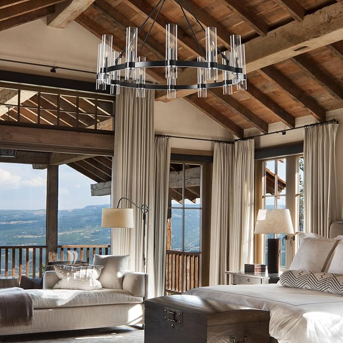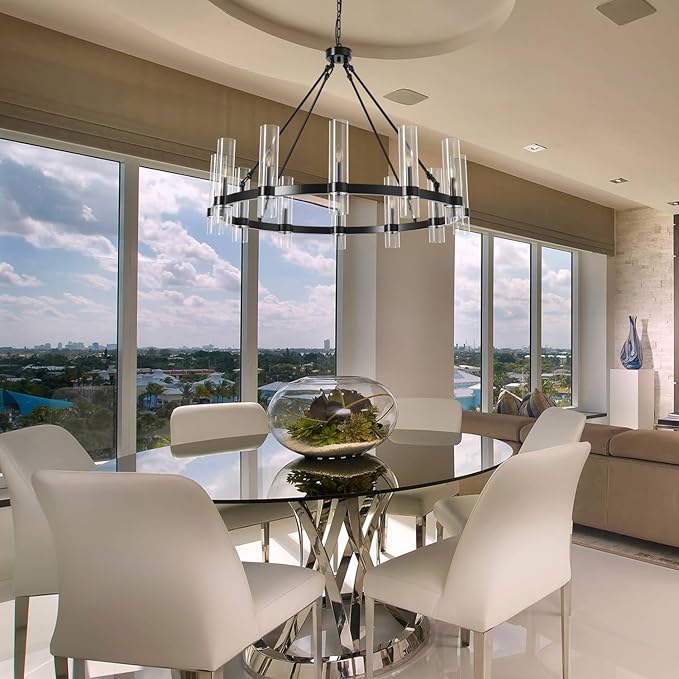 - 【Farmhouse Wagon Wheel Chandelier】This stylish black pendant light with clear glass shades features a high-quality round frame, blending rustic charm with modern aesthetics. Equipped with 12 E12 bulb sockets, this hanging chandelier provides excellent illumination and serves as a stunning centerpiece for dining rooms, living rooms, kitchens, bedrooms, and entryways. It seamlessly complements industrial, vintage, and contemporary decor styles.