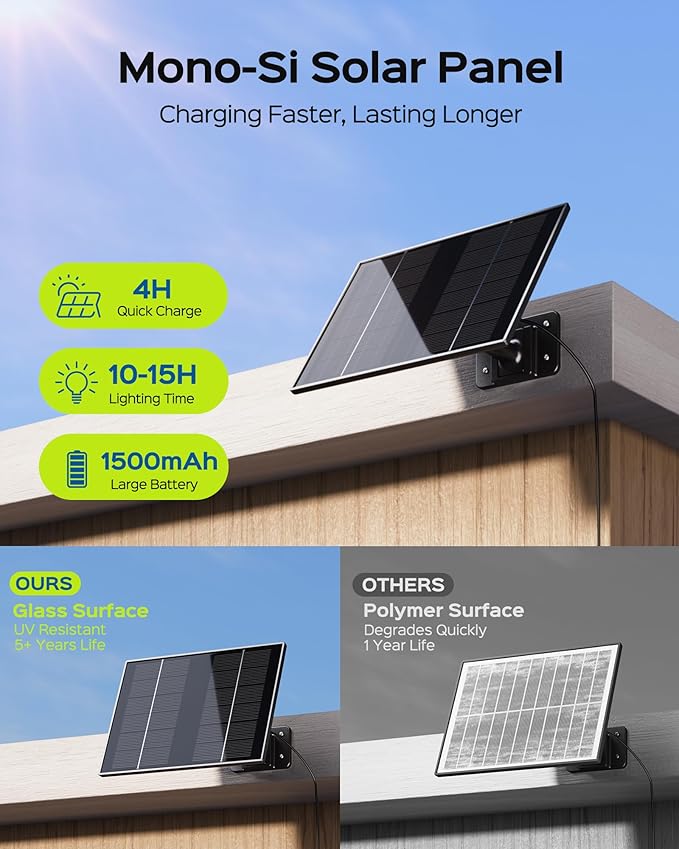 - FASTER SOLAR CHARGE: Charged by a powerful monocrystalline solar panel, the 1500mAh battery will be full in just 4 hours of intense sunlight, and powers 10-15 hours of illumination, depending on the working mode you select. Even in cloudy days with intermittent sunlight, like in autumn, this outdoor solar light will perform reliably.