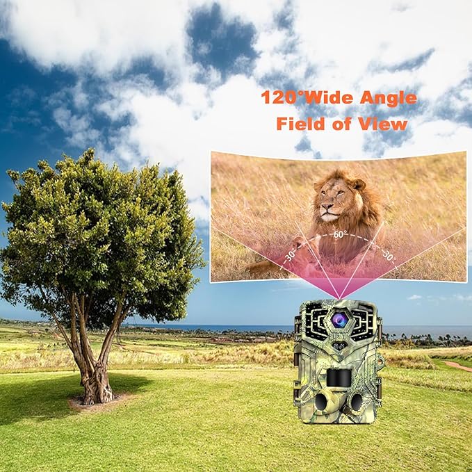 - 【Wide Detection Range & Quick Trigger】Never miss a moment! With a 120° wide-angle lens and 65 feet detection range, this camera captures every motion. Its 0.2-second trigger speed and 5-frame burst shooting ensure rapid response when wildlife passes by.