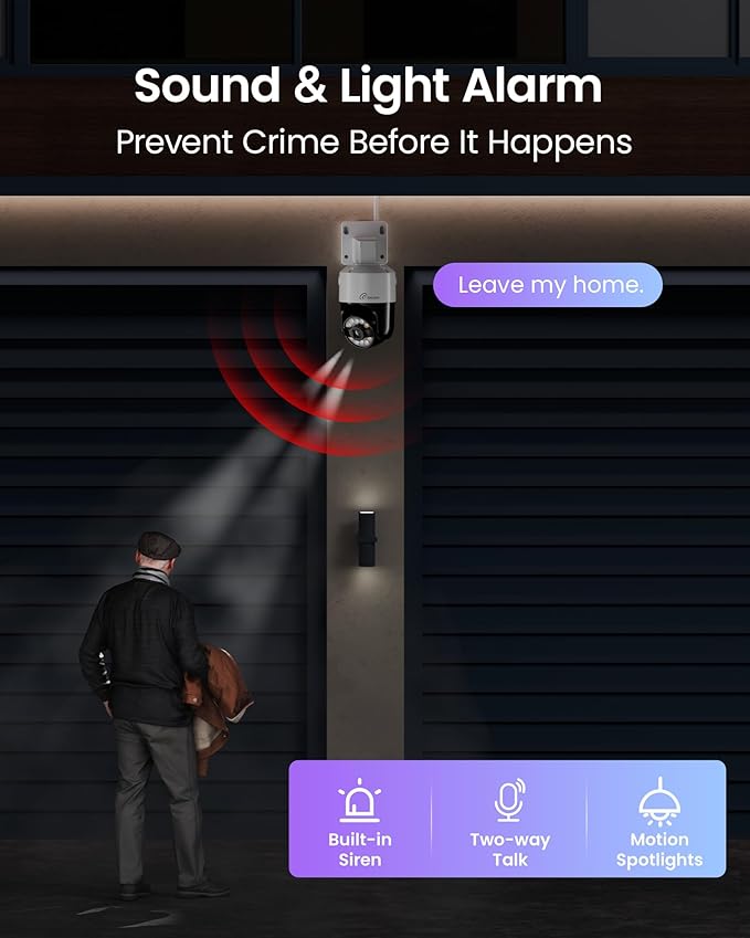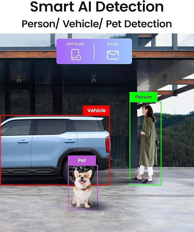 - Smart AI Detection, Multiple Instant Alerts: Enjoy smarter AI detection for movement, humans, vehicles, pets, and faces, reducing false alarms caused by shadows or leaves. The 8 channel security camera system automatically triggers siren and spotlight alarms when motion is detected and sends app push notifications directly to your mobile device. With just a glance at your lock screen, you'll know what's happening and won't miss any important events.