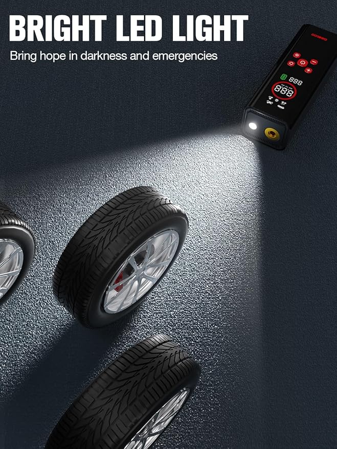 - Versatile and Portable:Not only a electric air pump, but also can be used as a mobile power bank or emergency LED light. Bright LED with 2 lighting modes (lighting and SOS) makes this portable car air pump suitable for roadside emergencies and night - time use.Moreover, it's 50% smaller and 30% lighter than traditional pumps, fitting easily into your car's glove compartment or backpack.