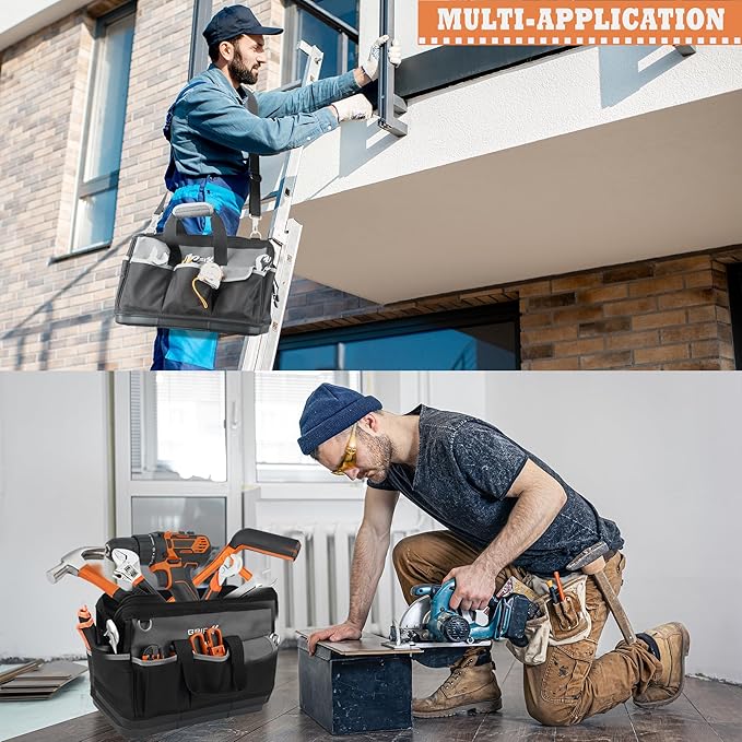 - ๐ Multi-pockets&Secure Pocket: The tool tote boasts 17 pockets(8 exterior and 9 inner pockets). The expanded interior space includes five well-sized pockets to keep your tools organized and safely stored, no need to rummage through the bag, and three larger pockets offer additional storage organizer for everyday tools in convenient bag.
