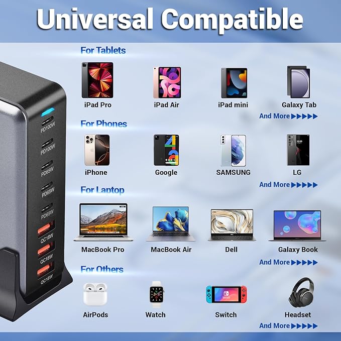 - [Universal Compatibility] Fast usb charging hub compatible with most devices that can be charged via USB-C and USB-A. Our Multiport USB Power Station are compatible with iPhone 16/15/14 Plus Pro Max, 13/13 Pro/13 Pro Max/13 Mini, for iPhone 12/12 Pro/12 Pro Max/12Mini, for iPhone 11/11 pro/11 pro max/XS/XS Max/XR/X/8 Plus/8/7/6 , for iPad Pro/iPad Air/iPad Mini, for Samsung Galaxy S23 Ultra/S22 Ultra/S21 Ultra Series, for Google Pixel 6/5/4a, headphone and more.