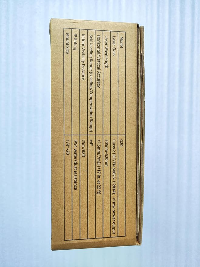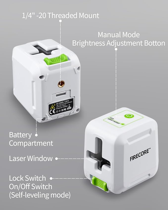- 【82Ft Cross Line Laser Level】Firecore G20 DIY self leveling laser level uses upgraded version of the diodes with brighter green beam, projecting 110° horizontal and 110° plumb line. Indoor working distance up to 82 ft with accuracy of ±1/17 inch at 23 ft, this cross-line laser ensures precise leveling for variety of tasks. Safety Class II, <1mW Power Output
