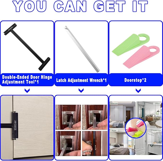 - 【Packaging Includes】Double-Ended Door Hinge Adjustment Tool*1,Doorstop*2,Latch Adjustment Wrench*1,Gloves*1,Instruction Manual*1.It is a vital tool for door repair professionals and a crucial safety tool for schools, shopping malls, garages, and other public areas with commercial hinged doors.