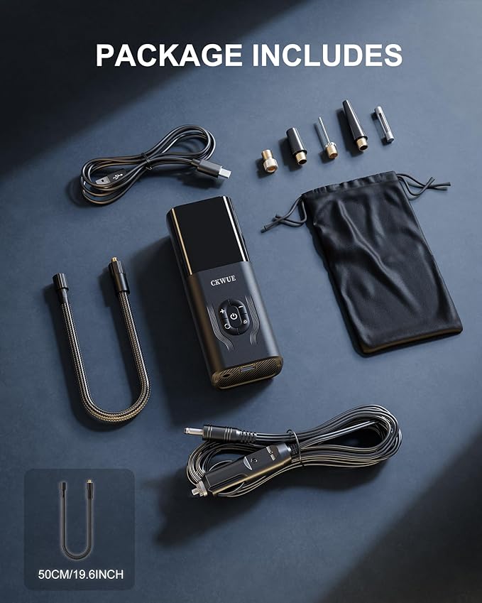 - 【Dual Mode Inflation】This portable tire inflator is equipped with a large-capacity battery, and no external power is required when in use. Even if the battery is exhausted, you can connect the car battery to power and inflate via the 12V DC port. In addition, the car air pump is equipped with a built-in LED light, which provides convenience for you to inflate or change tires in the dark.