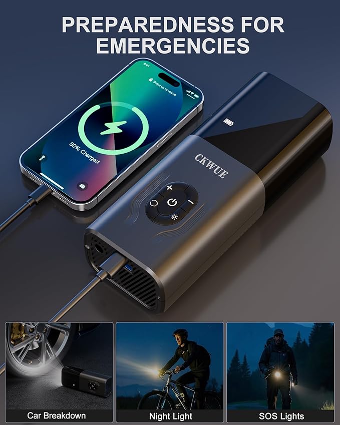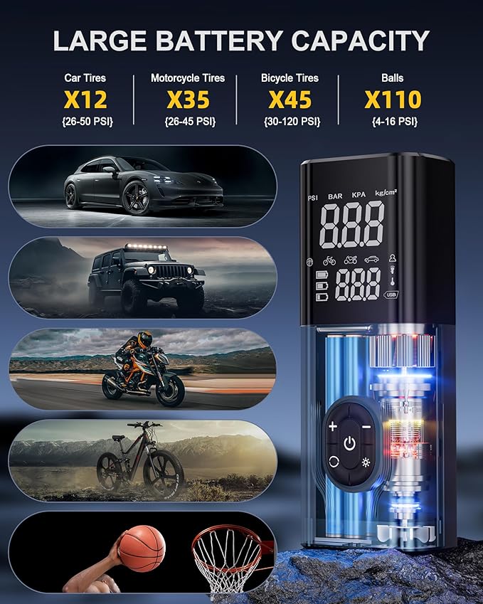 - 【Multi Functional Air Pump】The tire air pump features built-in rechargeable batteries, enabling tire inflation anytime, tire inflator has an LED light at the top that can be used to inflate in the dark, change tires and warn other vehicles at night. It also has a 5V/2A USB output/input port that can be used as an emergency power source for charging devices.
