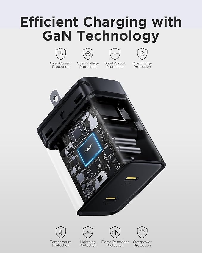 PISEN 45W USB C Charger - GaN Dual USB-C Wall Charger Block Fast Charging, Mini Foldable PD PPS for iPhone16/15/14 Pro, Pro Max, Mini, iPad Pro Series, Samsung Galaxy S23 Ultra, MacBook Etc
