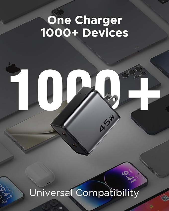 - [45W USB-C Fast Charging]: Featuring USB-C Power Delivery 3.0, dual USB-C ports with blind plug support up to 45W per port. The dual ports can simultaneously charge a smartphone, earbuds, and smartwatch at high speeds. Specifically designed for iPhone 16 series, it charges for iPhone 16 Pro to 56% and the Galaxy S24 to 61% in only 30 minutes. With PPS technology, the charger dynamically adjusts output voltage to ensure safe and efficient charging for iPhone, Galaxy, and other compatible devices.