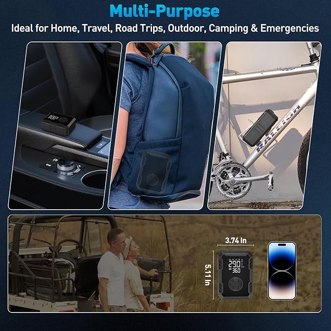 - Compact & Multi-Use Design: Lightweight yet powerful, this air compressor fits in your glove box or trunk. Comes with multiple nozzles for car tires, bike tires, basketballs, pool toys, and more—making it a must-have for outdoor life and daily use.