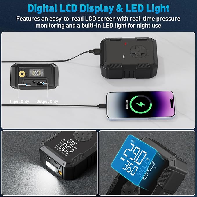 - Built-In LED Light for Night Use: Equipped with an integrated LED flashlight, this inflator makes nighttime tire checks and emergency roadside assistance easier and safer. Never be left in the dark when you're out on the road.