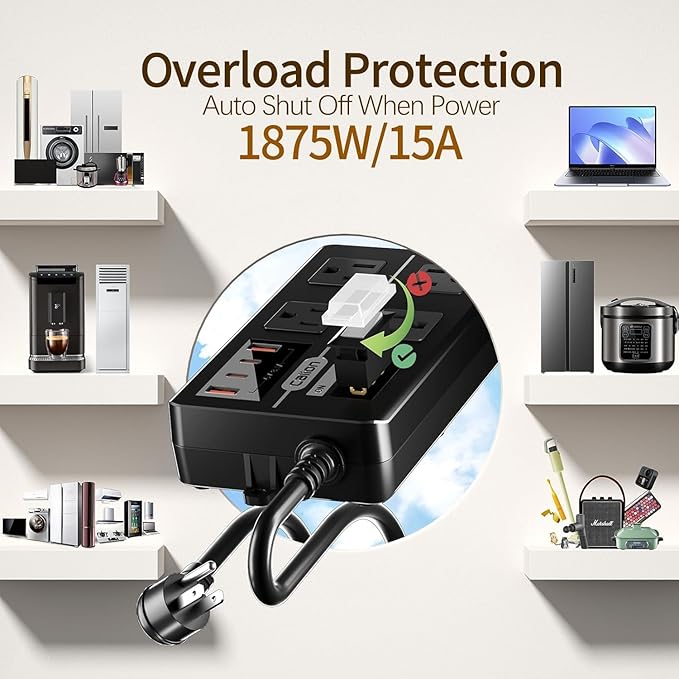 - 【8-in-1 Multi-Function Design】: Equipped with 4 wide-spaced AC outlets (1.8 inches apart), 2 USB-A ports, and 2 USB-C ports, this power strip can charge up to 8 devices simultaneously. Perfect for homes, offices, or outdoor activities. (Note: USB-C Not compatible with iPhone 15/16 original Type-C cables.)