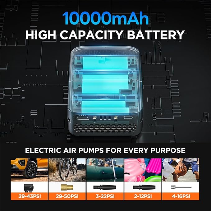 - Whether it's basketballs,car tires,or inflatable pools in your summer backyard,it's got you covered.With a max pressure of 10.3 bar and a max flow rate of 25 L/min,inflation is a breeze.The intelligent inflation mode allows you to set the target pressure,and it will automatically stop when the preset pressure is reached.The clear LCD display screen makes it easy to view parameters,while the built-in LED worklight provides modes of constant illumination and SOS signals. We also provide accessories such as the balloon adapter,ball needle,and Presta valve adapter,so you can use it immediately after purchase.