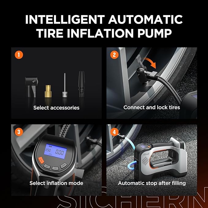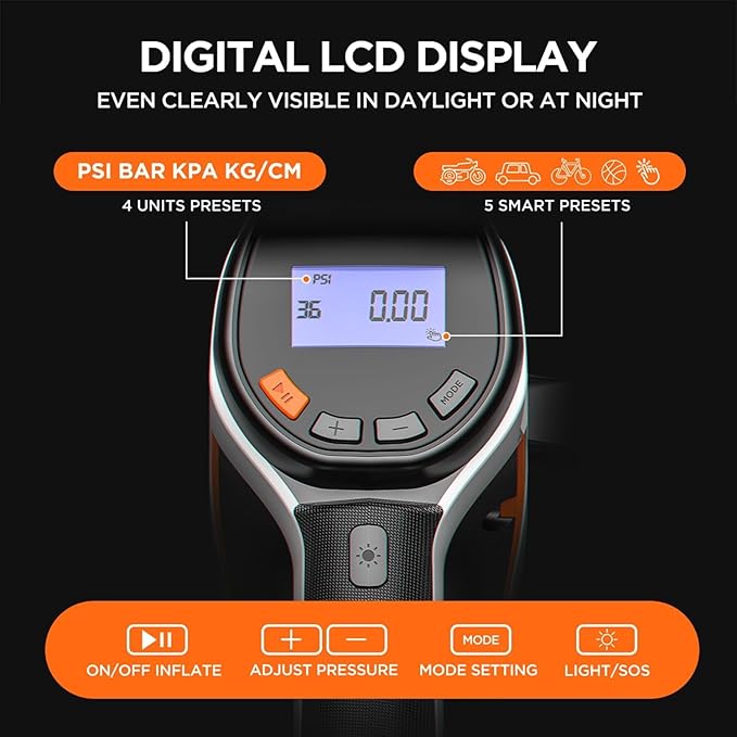 - 【Auto-Stop Mechanism】Automatic shutdown after reaching the target pressure to avoid over inflation. Rigorously tested for air tightness and efficient inflation.Read & set the target pressure value on the digital display. Choose your familiar pressure units from PSI, BAR, KPA, kg/cm².【Cool Down After Every 5 Min Of Working】